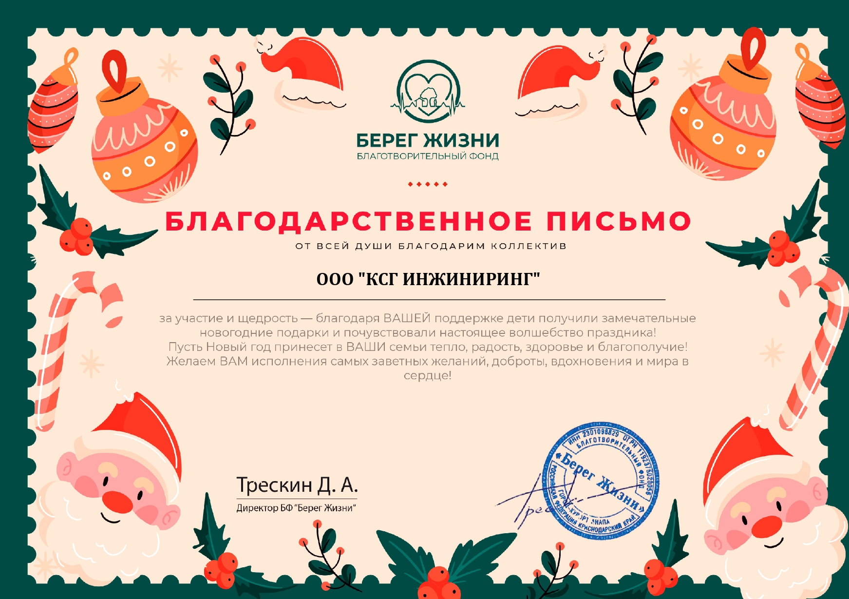 Компания ООО "КСГ Инжиниринг" приняла участие в новогодней акции Благотворительного фонда «Берег Жизни», оказав поддержку детям с различными заболеваниями.